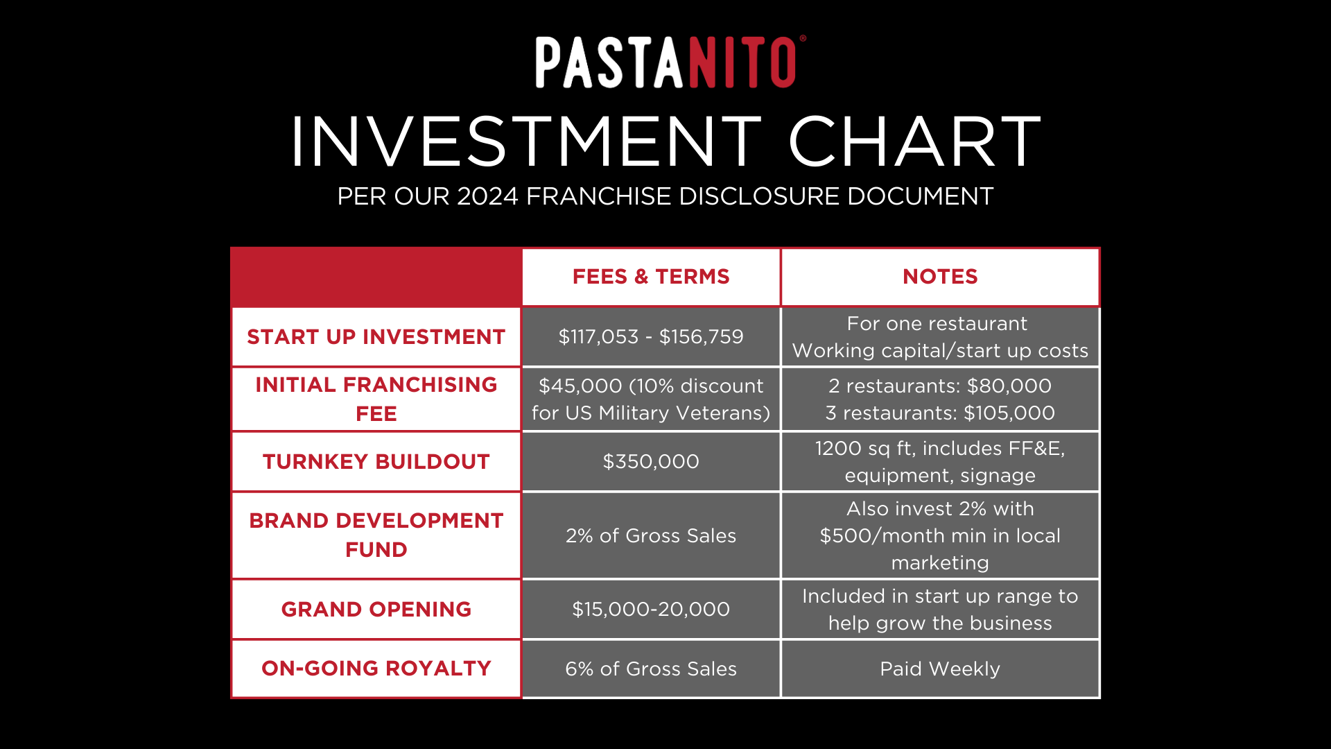 This chart outlines some key areas of the initial and ongoing investment. We help PastaNito owners to open quickly. Learn More or use our Pre-Qualification Calculator.